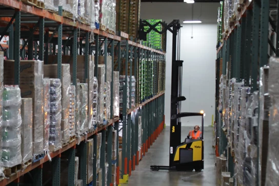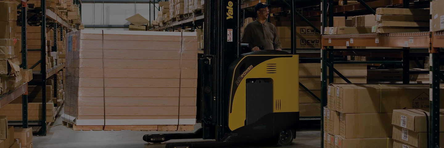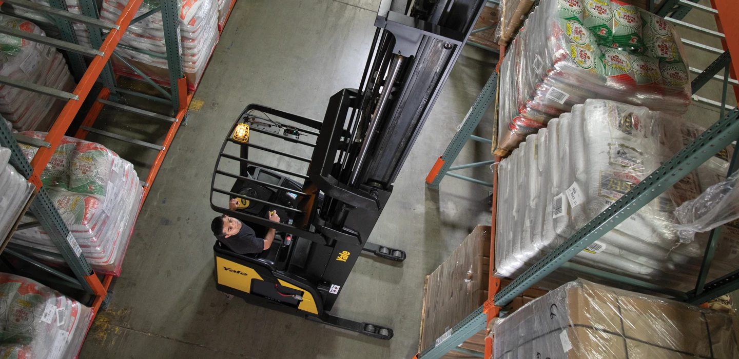 Yale reach truck forklifts, including the narrow aisle and reach truck with moving mast, are engineered for productivity in applications that demand high storage density and material handling throughput. Reach trucks, which are designed with forks that can extend not only upward but also forward, are primarily used for pallet storage and retrieval in warehouses or retail environments with narrow aisles of tall racking that require loads to be placed in double-deep or high-level storage locations. Whether picking or putting away pallets in locations at great height or navigating tight, efficient facility layouts, Yale reach trucks are designed to help operators move and store product with efficiency and precision.