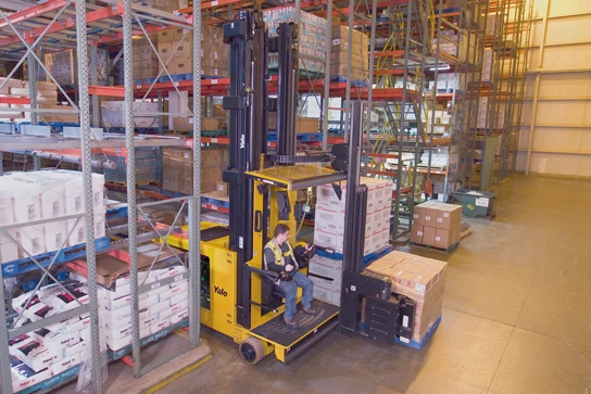 High density warehouses are exercises in efficiency, with layouts that maximize available space. The turret truck (VNA) is designed to maximize productivity in high, narrow aisle configurations.